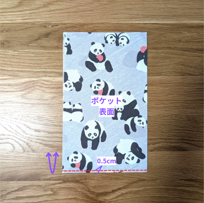 ポケット布を半分に折って、折山に0.5cmステッチをかけます。