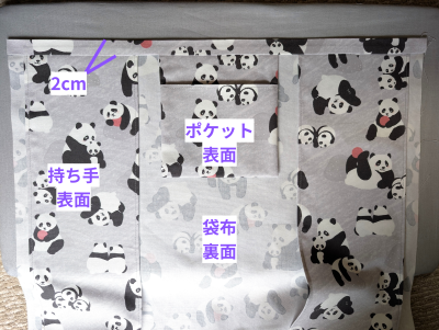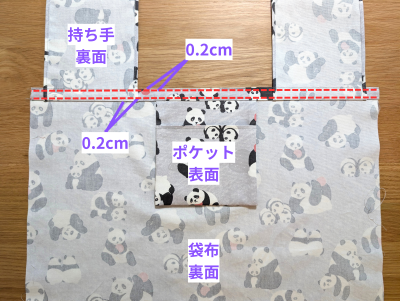 袋布の両端2cmの位置に持ち手を、中央にポケットを中表で合わせ