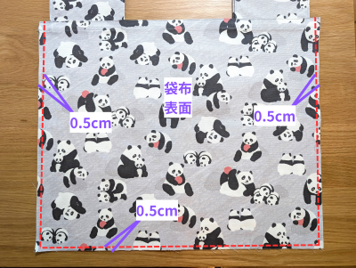 袋布を外表で合わせ、周囲を0.5cmでぬいます。