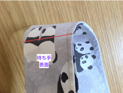 持ち手を上に倒して、袋口の三つ折り両端にそれぞれ0.2cmステッチをかけます。